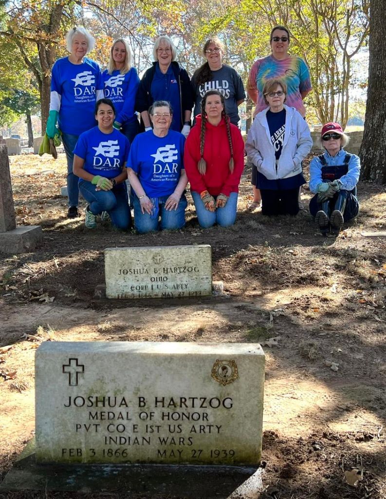 The Ladies of the Frederick Van Patten Chapter participated in many activities for the month of October. The chapter members celebrated the NSDAR Day of Service by volunteering to rake leaves, pick up trash and clean tombstones at the Gum Springs Cemetery. Following protocols on gravestone cleaning, many veteran tombstones received a much needed bath. Among the tombstones cleaned was that of Joshua Hartzog, who was a Medal of Honor Recipient! (see picture). The following weekend, chapter member Jocelynn regaled the members with the Boston Tea Party history and the push for it to be be a non-violent act of rebellion.