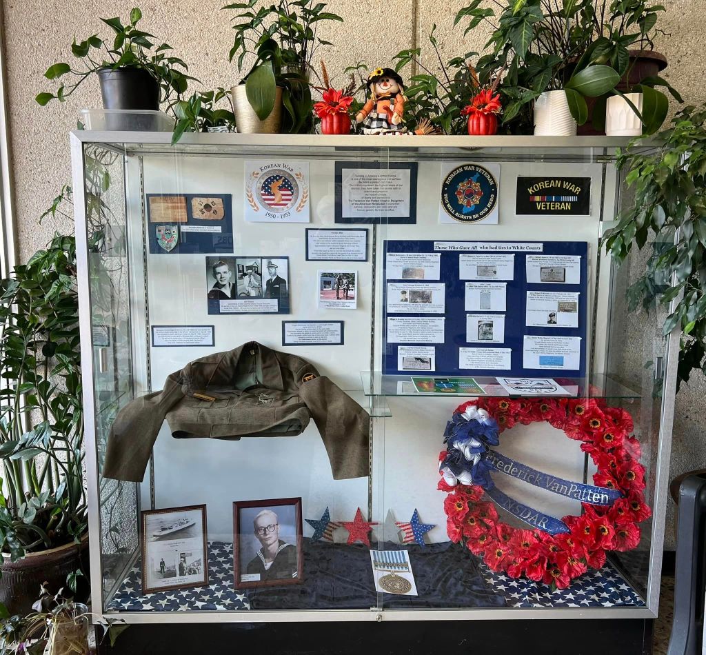 The ladies of the Frederick Van Patten Chapter proudly sponsor the display at the local library honoring Korean Veterans of White County. Many members contributed items, pictures, and memorabilia from their families to piece this together. The display will be at the Public Library for the month of November.